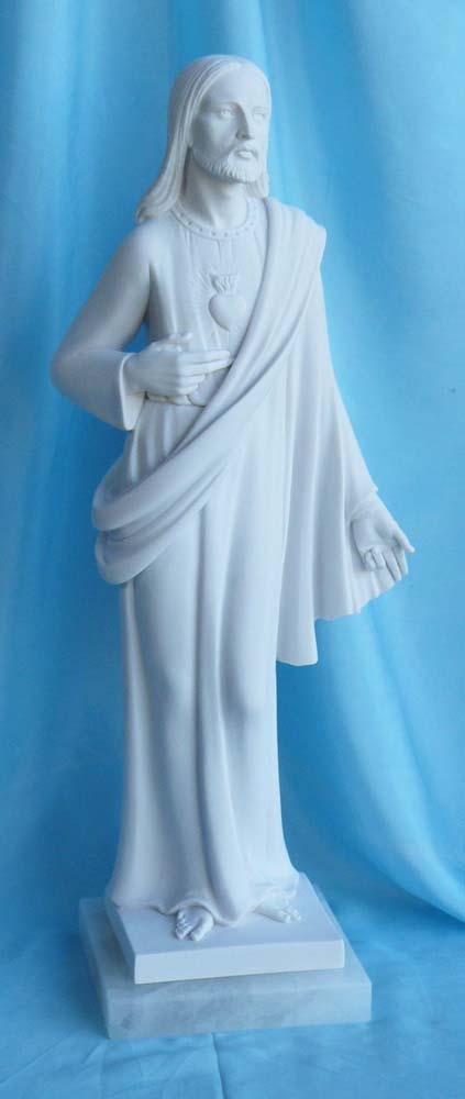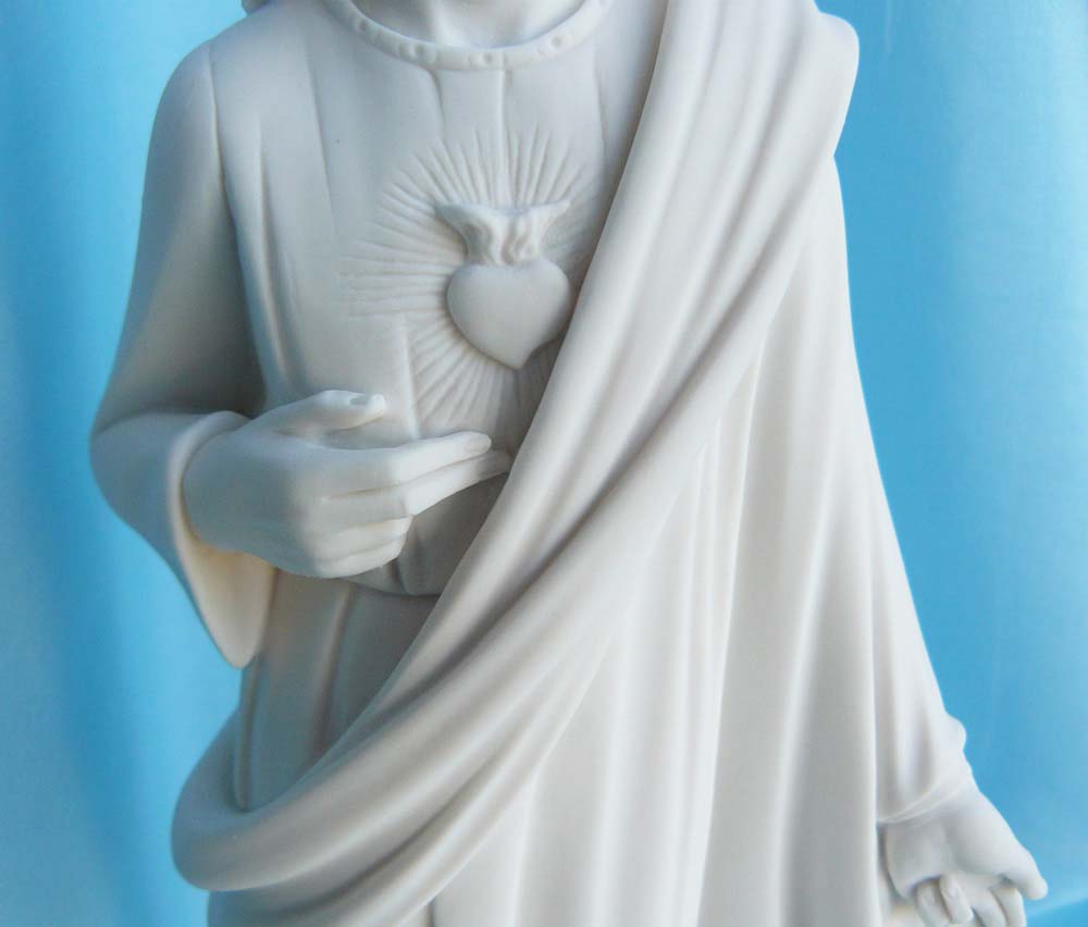 Statua che rappresenta il Sacro Cuore di Gesù nella figura del Cristo benedicente. L’espressione del volto di Gesù e tutti i particolari della statua, anche i più piccoli, sono molto realistici.