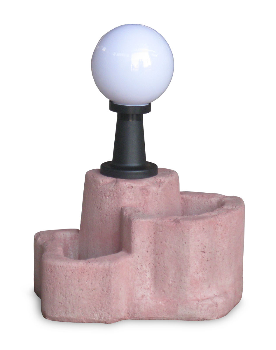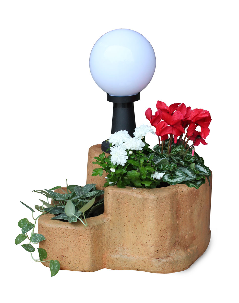 Originale lampada a sfera per l’illuminazione del giardino, con una base in finta roccia nella quale sono ricavati due vasi per fiori o piccole piante. E’ ideale per illuminare sia un piccolo angolo all’esterno della casa, sia interi sentieri e camminamenti.